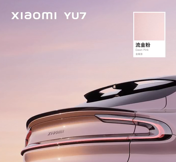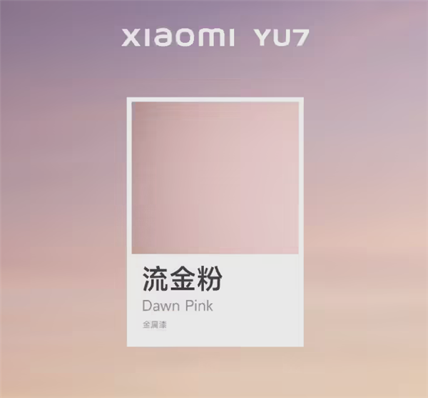 除此前公布的钛金属色、宝石绿、熔岩橙、寒武岩灰外,日前小米汽车公布了YU7第5种时尚色系——流金粉DawnPink。