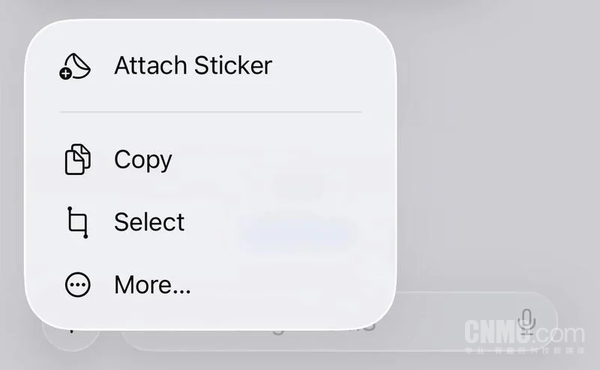 在Messages应用中,iOS 26新增了“选择”功能,允许用户在对话气泡中选择并复制文本的一部分。