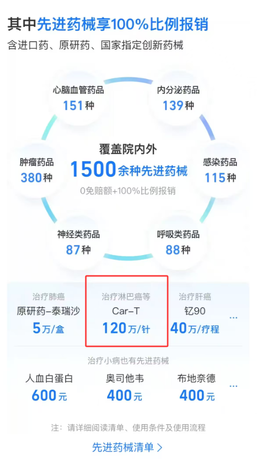 此次好医保2025新版升级后,可报销的先进药械清单囊括国内批准的全部CAR-T疗法,这也体现了发展商业医疗险的补充价值。