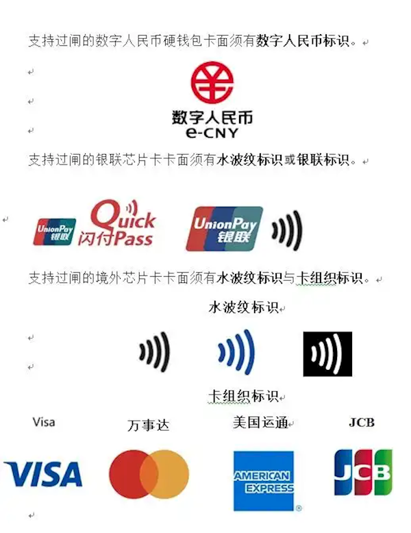 届时,乘客持银联、Visa、万事达(Mastercard)、美国运通(American Express)、JCB等主流芯片闪付卡及各类符合金融IC卡标准的手机Pay,或符合人民银行数字货币研究所标准的各形态数字人民币硬钱包,在全线网各座车站闸机直接刷卡,就能快速过闸。