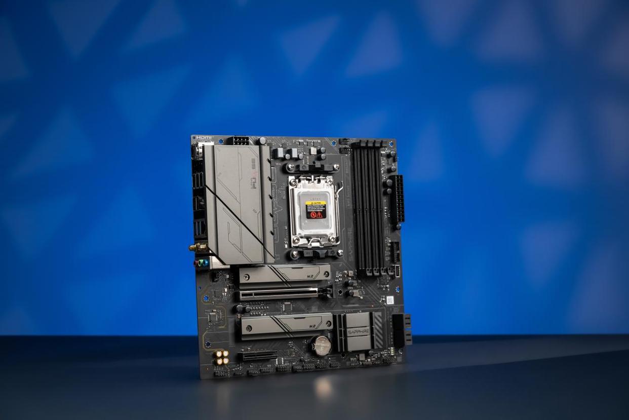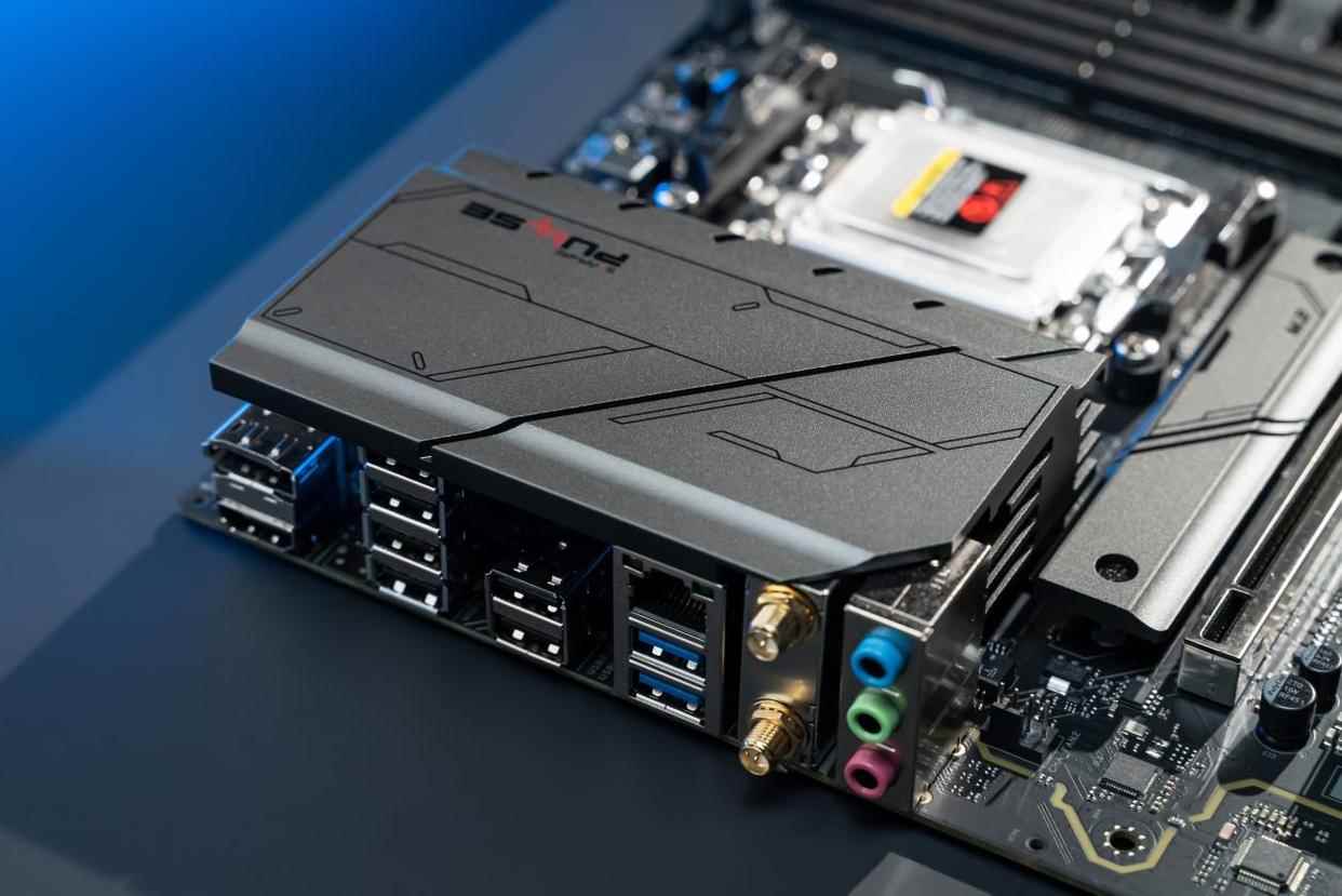 蓝宝石PULSE脉动B850MP WIFI属于蓝宝石的PULSE脉动系列,外包装印有心电图波形符号,与脉动的产品名相互呼应。主板主体为黑色,通过VRM散热片、SSD散热片和芯片组散热片的造型、科技风格装饰纹理,打造出金属质感强烈的科技范。