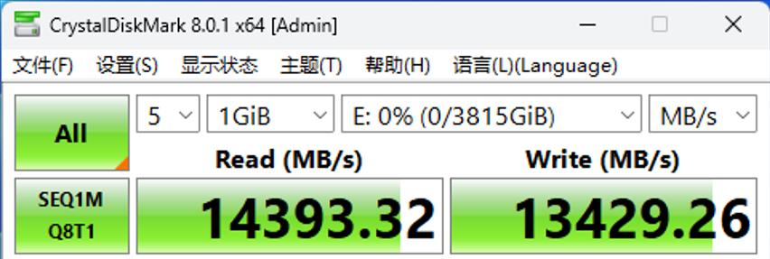 考虑到蓝宝石PULSE脉动B850MP WIFI还提供了PCIe 5.0 M.2 SSD插槽,我们就用佰维X570 PRO 4TB测试了该插槽的性能表现。在《CrystalDiskMark》测试中,该SSD的顺序读写速度分别达到了14393MB/s和13429MB/s,都超过了SSD的标称值,表明蓝宝石PULSE脉动B850MP WIFI的PCIe 5.0 M.2 SSD插槽在性能上也未缩水。