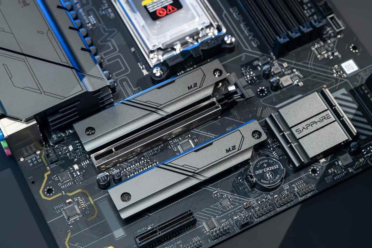 主板提供了2个M.2插槽,分别为PCIe 5.0×4和PCIe 4.0×4规格,所有插槽均配备了散热片,确保SSD不会因为过热而降频。主板还板载了3个5V ARGB接针和5个4pin风扇接针,为用户在扩展灯光设备和风扇时提供了便利。搭配Trixx软件以及Windows 11的动态光效设置,用户可以对灯效进行个性化的调校。