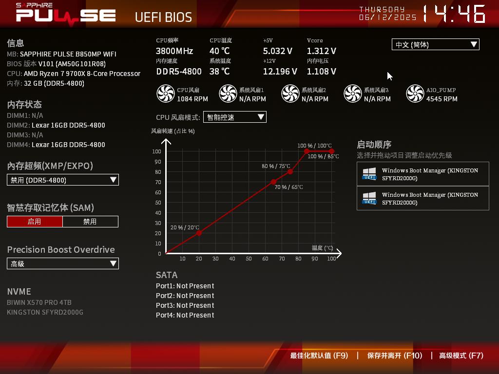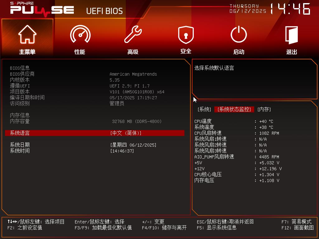 蓝宝石PULSE脉动B850MP WIFI的BIOS界面为红黑配色,在EZ模式下,可以了解CPU、内存、SSD等硬件的信息,也能对内存超频、PBO功能选项、启动顺序、风扇模式等功能进行简单的调校。