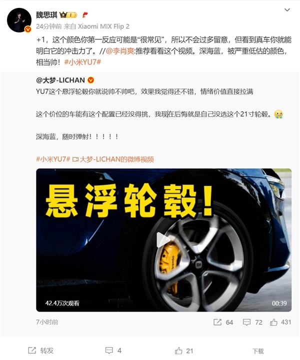 电脑知识网6月30日消息,小米汽车副总裁李肖爽表示,小米YU7深海蓝是一款被严重低估的颜色,相当帅。