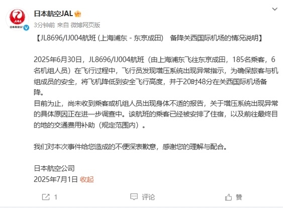 日本航空发文表示,称目前没有收到乘客或机组人员身体不适的报告,增压系统异常的具体原因正在调查中。