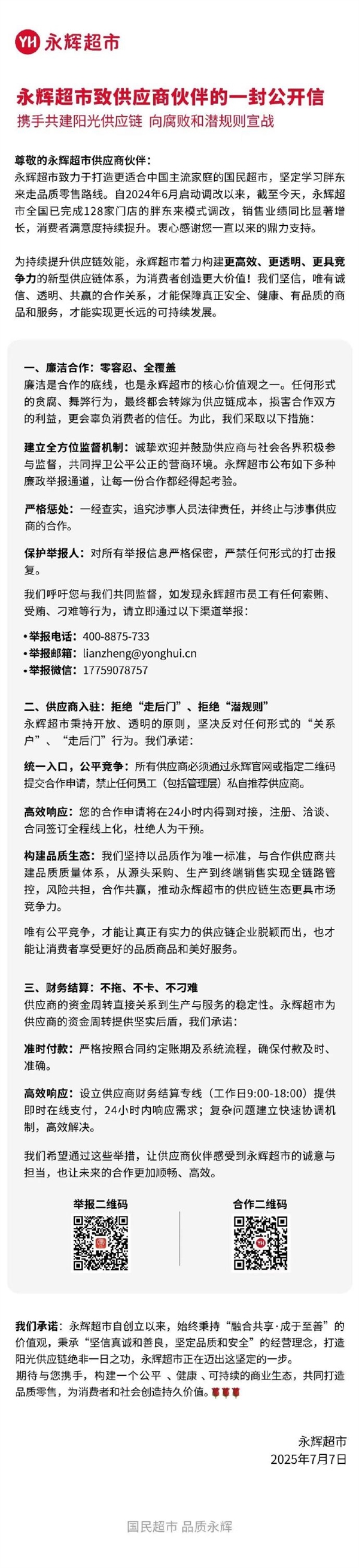 电脑知识网7月7日消息,今日,永辉超市发公开信称,向腐败和潜规则宣战。