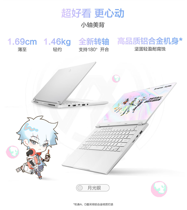 外观方面,天选Air 2025继承了天选家族高颜值、新潮的特点。其机身A,D面采用高品质铝合金打造,抗腐蚀耐磨损的同时有极具质感,月光银配色优雅灵动,搭配14英寸小巧机身,尽显时尚高颜的潮玩气息。