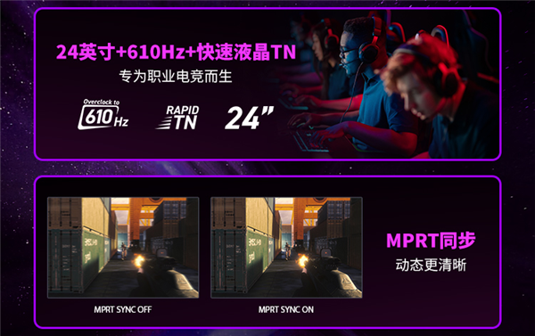 这款显示器最大的亮点,就是其高达610Hz的刷新率,再加上专业级快速液晶TN面板的超低响应时间,完美解决了画面模糊与拖影。