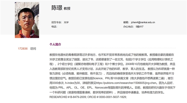 陈璟教授在自己的个人简介中写道:自己“应该拿不到诺奖”,个人荣誉“都是浮云而已”,也“不会帮学生找工作”。有网友表示,两位教授“太接地气了”。