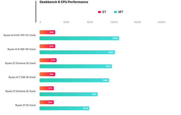 在CPU性能测试中,AMD Ryzen Z2 Extreme SoC在单线程性能测试中超越了所有其他Strix Point APU,而多线程性能则与10核的Ryzen AI 9 365相当。
