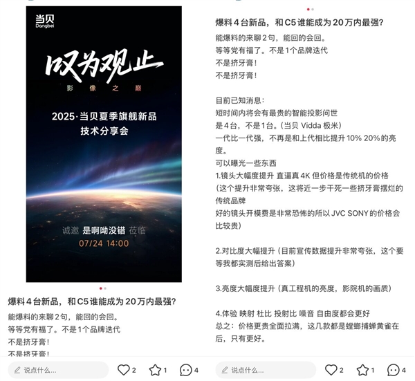 随着当贝年度旗舰新品发布日期的日益临近,这场技术分享会就像一颗 “开胃菜”,吊起了大家的胃口。我们不禁好奇,这款让专业人士都赞不绝口的新品,究竟还隐藏着多少惊喜?它将以怎样的姿态重新定义家庭投影?让我们一起满怀期待,等待新品正式发布,见证影像之巅的诞生。?