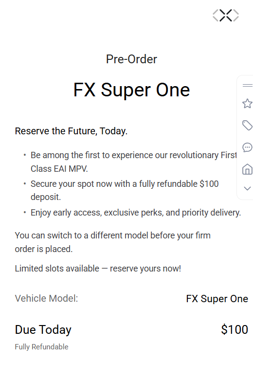 尽管这个订单只需要收取 100 美元,比小米 YU7 那5000元子低不少,还可以退。但算是比没有好吧,而且抛开概念炒作外,这车也有实用价值。