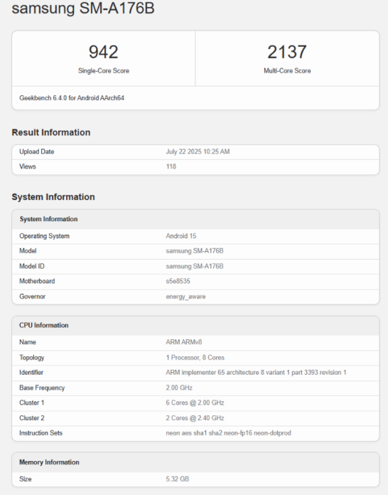 A17 5G还支持LPDDR4X和LPDDR5内存规格,测试机型配备6GB RAM,预计也将提供4GB和8GB版本。存储方面支持UFS 2.2和UFS 3.1两种规格,有助于提升读写速度。屏幕方面,虽然Exynos 1330支持最高120Hz刷新率的1080p+显示,但参考前代机型,A17 5G很可能仍将限制为最高90Hz刷新率。
