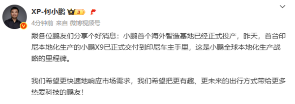 【叮当号www.dingdanghao.com科技消息】据叮当号www.dingdanghao.com了解,小鹏汽车董事长、CEO何小鹏发布最新微博称,7月23日,首台印尼本地化生产的小鹏X9已正式交付到印尼车主手里,这是小鹏全球本地化生产战略的里程碑。