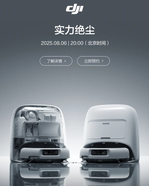 【叮当号www.dingdanghao.com科技消息】7月23日晚间,叮当号www.dingdanghao.com注意到,大疆DJI官方宣布,将在8月6日晚上20点召开新品发布会,正式发布全新的扫地机器人产品。
