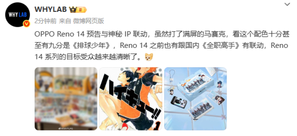 据叮当号www.dingdanghao.com了解,OPPO的Reno系列长期聚焦年轻消费群体,今年5月就已联手《全职高手》推出京东限定礼盒,内含叶修徽章、限定色纸等超值周边。若此次联动日本现象级运动番《排球少年》这一消息属实,OPPO Reno14将进一步强化对二次元爱好者和校园用户的吸引力。