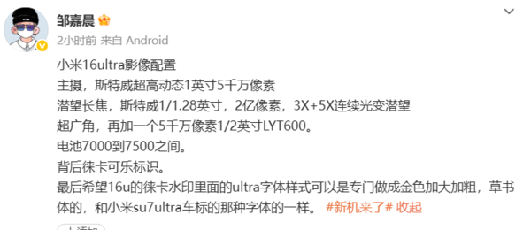 在性能配置方面,小米16 Ultra将搭载第二代骁龙8至尊版移动平台。该机将内置一块7000-7500mAh的大容量电池,或搭配100W快充+50W无线充,能够实现长久续航。另外,16 Ultra可能采用3D打印钛合金中框,相比金属中框重量更轻、质感更好。