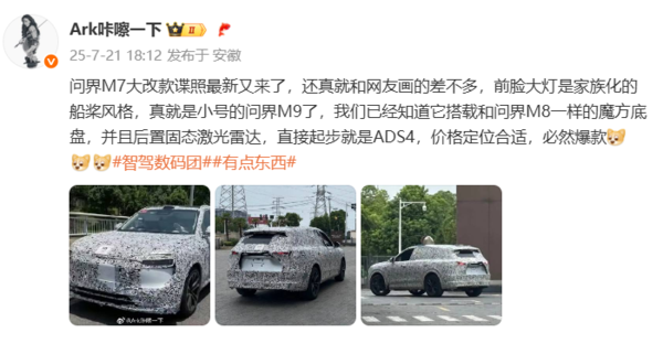 注意到,此前有博主爆料称,全新问界M7的尾部将采用三段式贯穿尾灯,标配后向固态激光雷达,有望进一步提升辅助驾驶能力。同时,新车将搭载与问界M8同款的魔方底盘+CDC可变阻尼减振器,预计配备HUAWEI ADS 4.0,支持“车位到车位”全场景辅助驾驶。