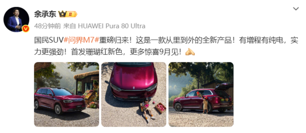 【科技消息】7月28日,华为常务董事、终端BG董事长余承东在社交平台上发文称,国民SUV问界M7将是一款从里到外的全新产品,首发珊瑚红新配色,有增程和纯电双版本,预计将于2025年9月正式上市。