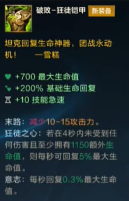 英雄联盟手游5.1版本破败狂徒铠甲怎么样?英雄联盟手游中近期为玩家们更新了全新的版,在这个全新的版本中为玩家们带来了全新的英雄和装备,破败狂徒铠甲就是其中的一个装备,这个装备一般坦克会进行出装,能够帮助玩家们增加700的生命值,且百分之两百的生命恢复和10技能极速,在受到伤害的时候话还可以获得额外生命值,让玩家们拥有更多的扛上能力!