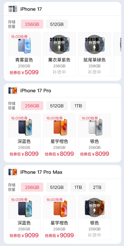 具体补贴后价格如下:iPhone 17:256GB 售价 5099 元、512GB 售价 7099 元;iPhone 17 Pro:256GB 售价 8099 元;512GB 售价 10099 元;1TB 版本暂时缺货。iPhone 17 Pro Max:256GB 售价 9099 元;512GB 售价 11099 元;1TB 暂无供应;2TB 售价 17099 元。