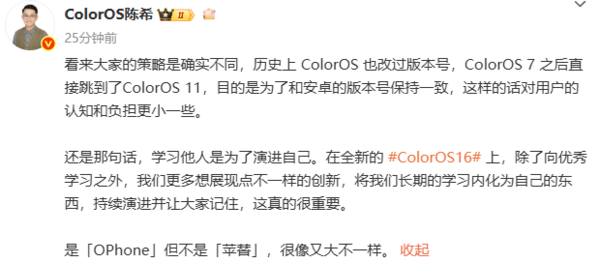 陈希表示,此前,ColorOS 7之后直接跳到了ColorOS 11,这一调整是为了与安卓版本号保持一致,从而降低用户认知负担,让用户在使用过程中更加便捷。