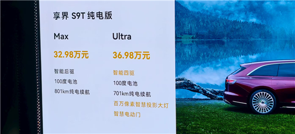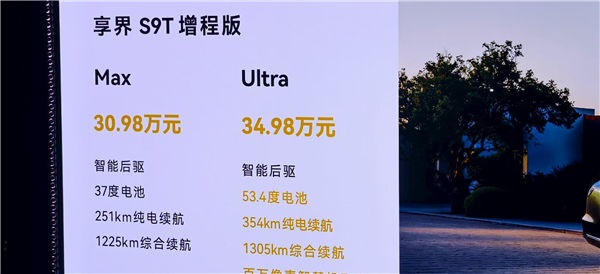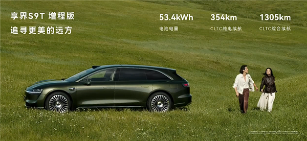 新车提供增程和纯电两种动力,其中享界S9T增程版配备37kWh及53.4kWh电池包,CLTC纯电续航里程最长可达354km,满油满电CLTC续航里程最长可达1305km,可加92号汽油。