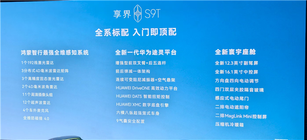 辅助驾驶方面,享界S9T搭载HUAWEI ADS 4辅助驾驶系统,车顶配备有华为192线激光雷达,车身四周拥有高精度固态激光雷达、4D毫米波雷达,拥有全向感知能力。