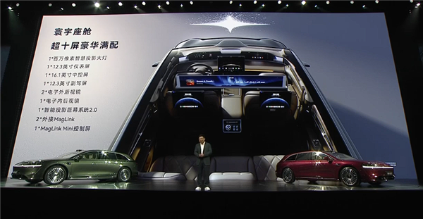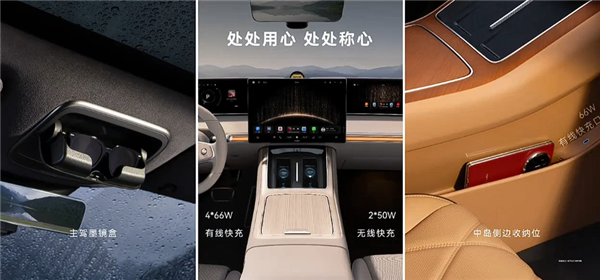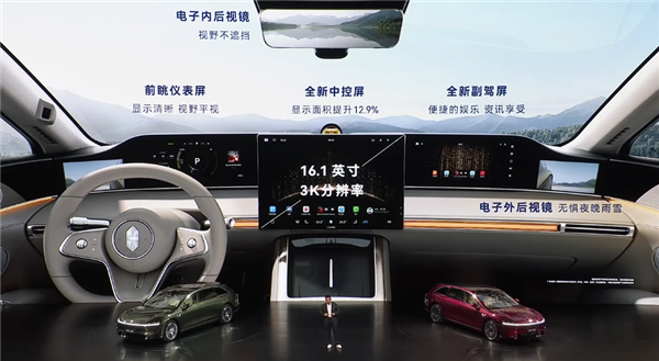 车内设计换新升级,增加了全新的副驾驶娱乐屏,中控屏尺寸升级到16.1英寸,分辨率达到了3K级别,还配有车内电子后视镜、双50W无线手机充电面板以及旅拍功能。