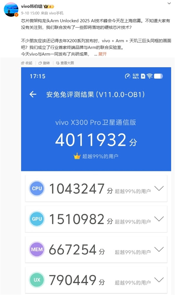 在正式发布前,联发科天玑9500的性能已初现锋芒。根据vivo韩伯啸曝光的信息,搭载天玑9500的vivo X300Pro在安兔兔V11 Beta中斩获401万分,相较于去年天玑9400的vivo X200 Pro 285万分实现约41%的整体性能提升,其中CPU从85万提升至104万(+22%),GPU从100万提升至150万(+50%),展现出在复杂计算与图形渲染方面的强大实力。