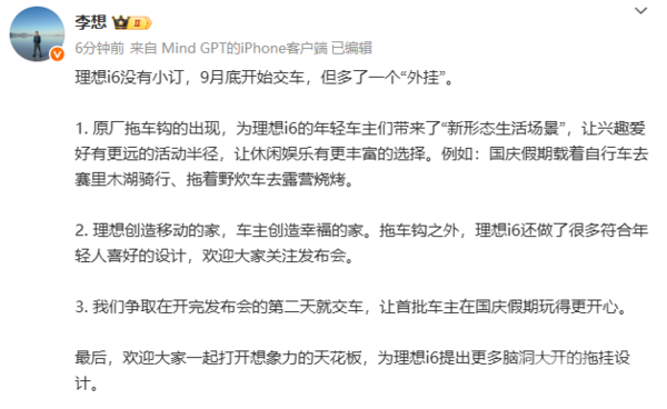 【科技消息】9月17日,理想汽车CEO李想发文称,理想i6没有小订环节,9月底将开启交付。同时,新车将自带拖车钩。值得注意的是,为了让首批车主能够尽快体验到理想i6的魅力,李想表示,将争取在发布会结束的第二天就启动交车工作。