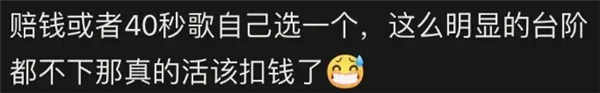 然而,也有网友觉得顾客提出“赔钱或者唱40秒歌选一个”,这已经是很明显的台阶了,店员若不下这个台阶,那被扣钱也是自找的。