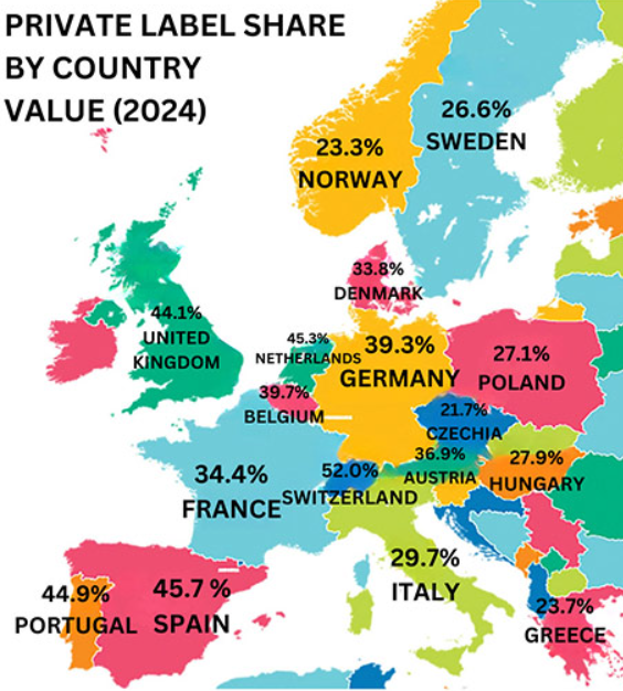 根据 NielsenIQ 的数据,预计 2024 年,自有品牌的总销售额将达到 3520 亿欧元,其中最大的三个食品杂货市场,德国、英国和法国的自有品牌合计份额为 39.7%