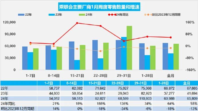 乘联会发布数据,初步统计,1月1-31日,乘用车市场零售204.0万辆,同比增长58%,环比下降13%。今年以来累计零售204.0万辆,同比增长58%。1月1-31日,新能源车市场零售67.0万辆,同比增长102%,环比下降29%。今年以来累计零售67.0万辆,同比增长102%。