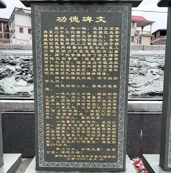 凤凰新闻报道,据博主师永刚消息,字节跳动创始人张一鸣的老家,给他立了一块功德碑。张一鸣捐了266万,几乎以一己之力承担了重修祠堂的费用。碑文称:字节跳动是最早把人工智能应用于移动互联网场景的科技企业,是人工智能助力内容变现的开山鼻祖,旗下抖音模块开了社交媒体粘性吸粉营销(短视频直播带货)之先河,进而成为中国为数不多的将科技发明与财富创造快速融合的成功典范,是亿万青年创业者顶礼膜拜的精神偶像。
