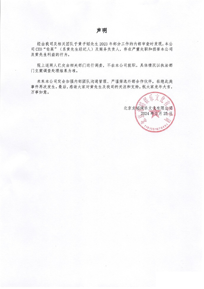 黄子韬公司CEO被调查 黄子韬公司龙韬娱乐发布声明,称CEO(原黄子韬经纪人)和商务负责人严重失职,现已交由相关部门调查。 上一篇:蔚来副总裁沈斐:丹麦换电站已开始向电网提供调频服务 下一篇:AI游戏初创公司奇酷网络宣布获得500万元天使投资