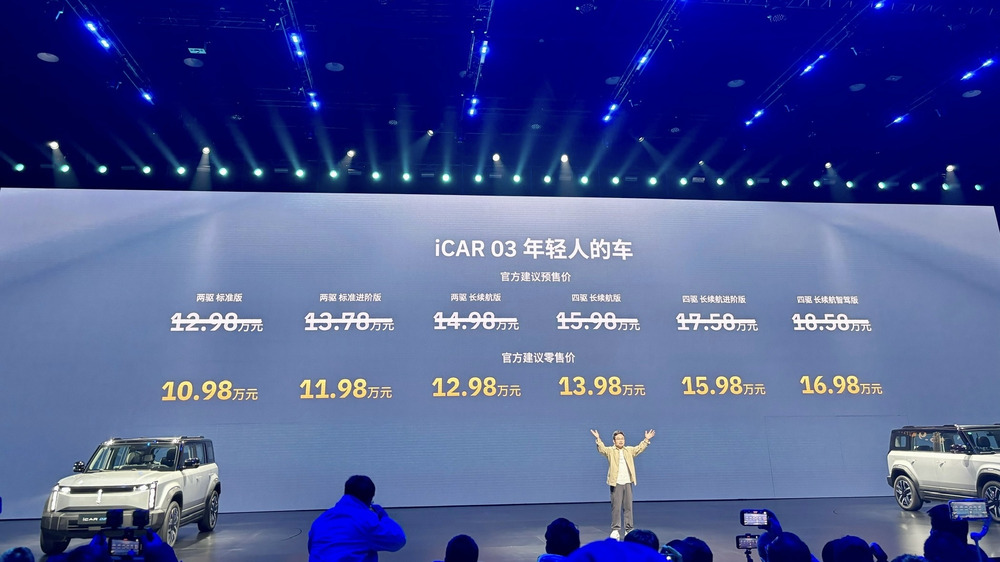 奇瑞 iCAR 03 纯电 SUV 上市,售价 10.98 万元起 奇瑞旗下 iCAR 品牌首款车型 iCAR 03 今晚正式宣布上市,官方指导价 10.98-16.98 万元。 上一篇:一加 Ace 3 原神刻晴定制机发布:售 3399 元 下一篇:小米汽车回应3月28日正式发布:具体时间会通过官方渠道公告