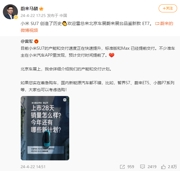 蔚来回应雷军推荐 4月22日,雷军发文称,目前小米SU7的产能和交付速度正在快速提升,标准版和Max已经提前交付。他表示,将在北京车展上,会详细介绍产能和交付计划。(虎嗅网) 上一篇:中国移动发布2024第一季度成绩单:净利润296亿元 增5.5% 下一篇:张家界:2023年净亏损2.39亿元